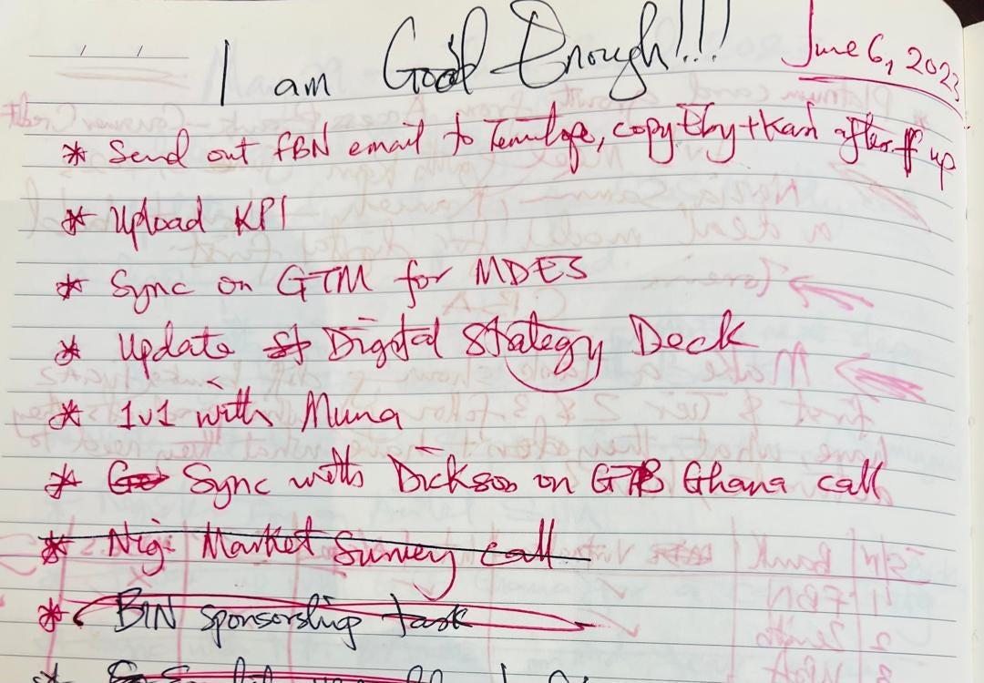 Before I write my to-do for the day or week, I would first write “I am Good Enough”. Almost any chance I get, I would remind myself that I was good enough.